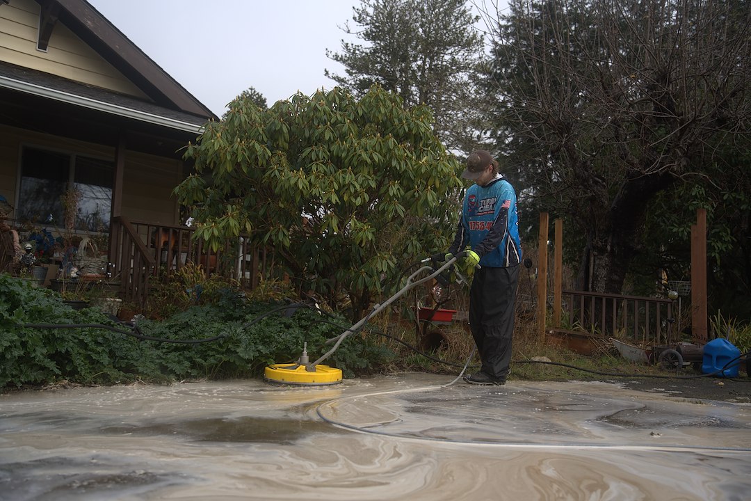Our team used a commercial surface cleaner to ensure even, streak-free results while protecting the integrity of the concrete. To fully eliminate the root cause of the staining, we applied a professional algaecide solution designed to kill mold, mildew, and algae at the source—not just wash it away. This treatment helps keep the concrete cleaner for longer and slows future regrowth.